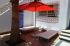 -une terrasse ombragée avec salon de jardin et bains de soleil.
